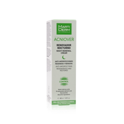 Acniover Renovador Nocturno è il nuovo alleato per combattere l'acne, poiché stimola la rigenerazione della pelle, riduce le imperfezioni e riduce al minimo i pori. Grazie alla combinazione dei suoi ingredienti: complesso di alfa idrossiacidi (acido glico e acido mandelico), acido salicilico, nicotinammide e bioattivi vegetali, è la crema notturna ideale per la pelle grassa con tendenza acneica.